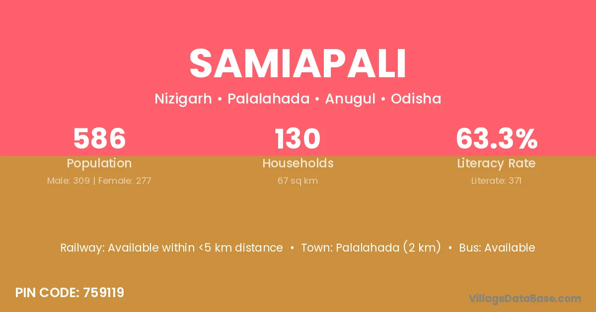 Palalahada (2 km) is the nearest town to Samiapali village for major economic activities and is located approximately 2 km away.