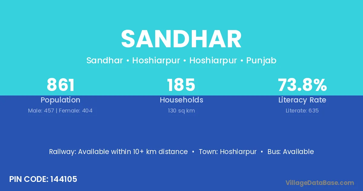The literacy rate of Sandhar village is 26.08%. Male literacy stands at 32.03% and female literacy at 19.48%.