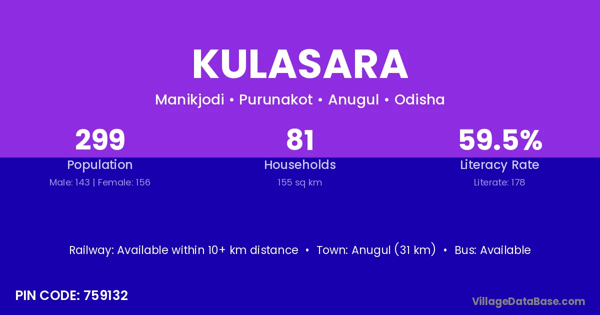 Anugul (31 km) is the nearest town to Kulasara village for major economic activities and is located approximately 31 km away.