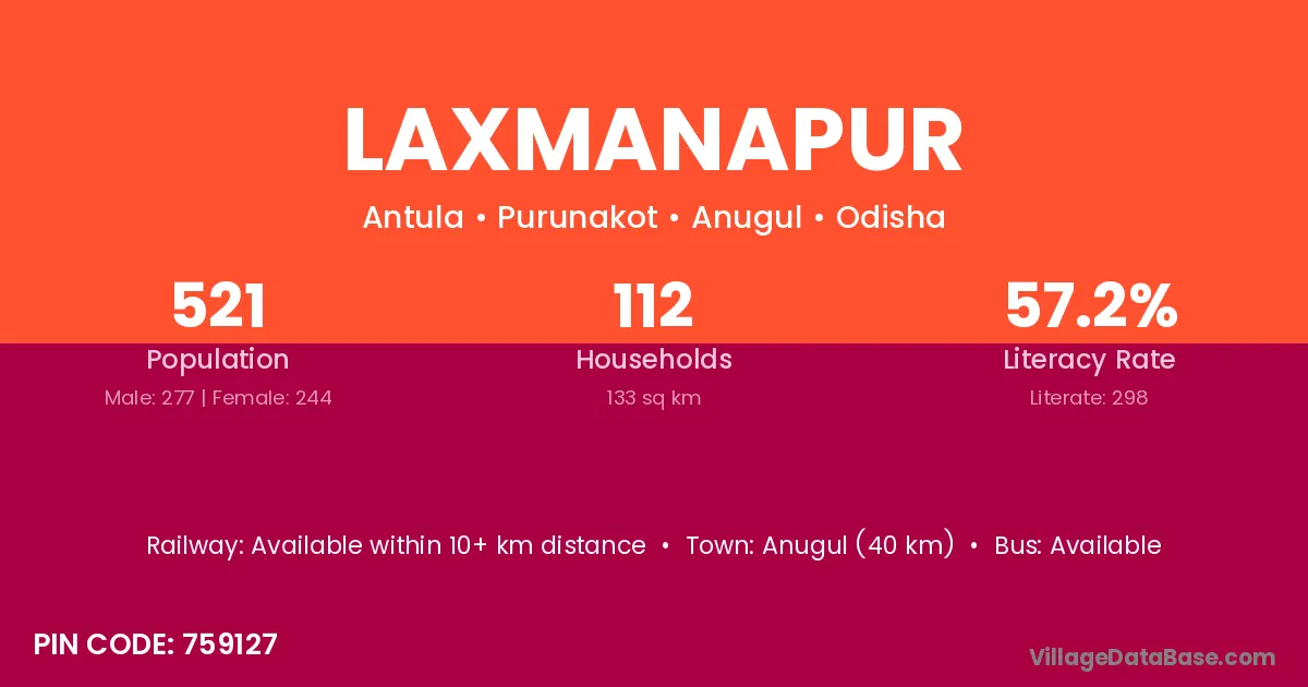 Anugul (40 km) is the nearest town to Laxmanapur village for major economic activities and is located approximately 40 km away.