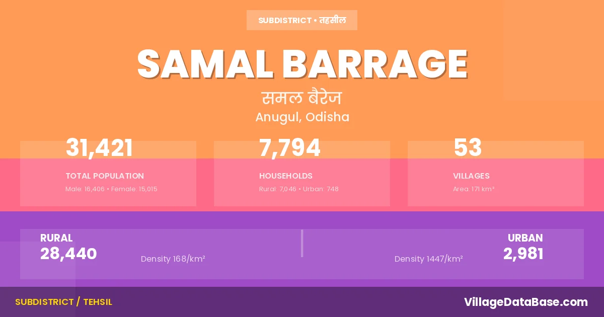 Samal Barrage is a town and Tehsil in the Anugul district of the Odisha. In India, a Tehsil is a subdivision of a district responsible for the administration and revenue collection of a specific area within the district. Tehsils play a crucial role in the local governance structure, contributing significantly to the development and administration of their communities.