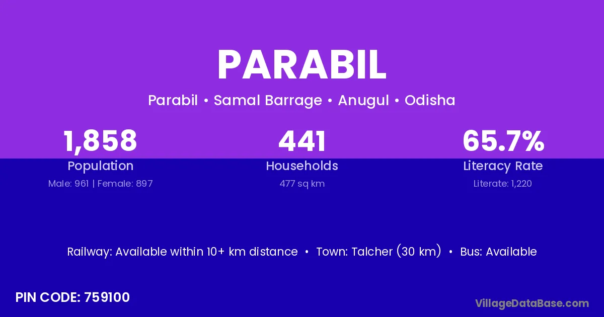 Talcher (30 km) is the nearest town to Parabil village for major economic activities and is located approximately 30 km away.