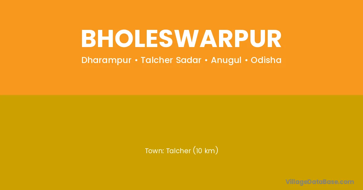 Talcher (10 km) is the nearest town to Bholeswarpur village for major economic activities and is located approximately 10 km away.