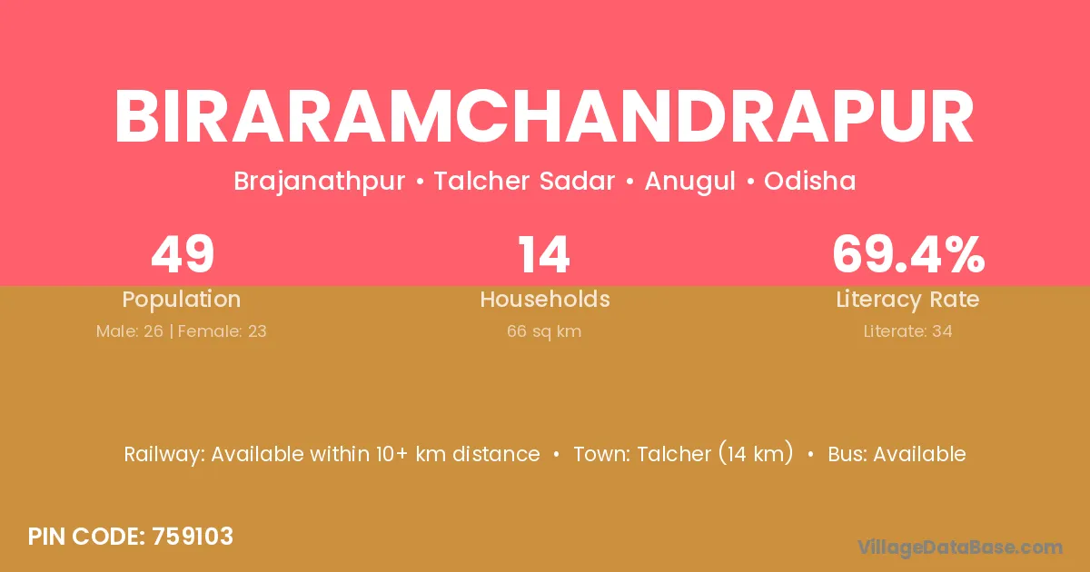 Talcher (14 km) is the nearest town to Biraramchandrapur village for major economic activities and is located approximately 14 km away.