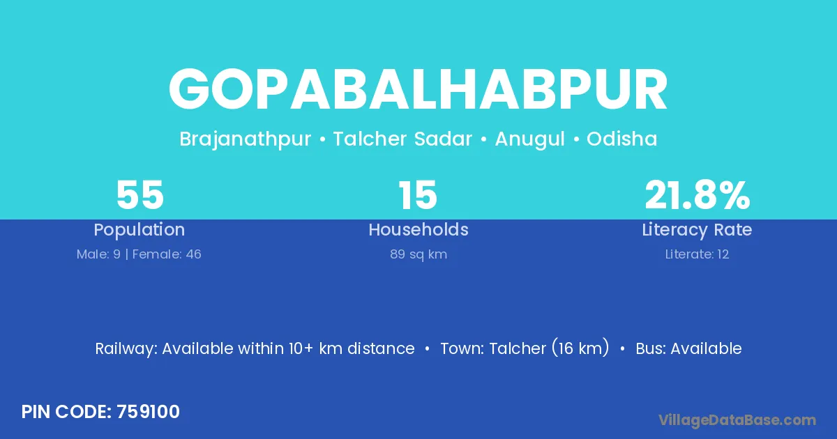 Talcher (16 km) is the nearest town to Gopabalhabpur village for major economic activities and is located approximately 16 km away.