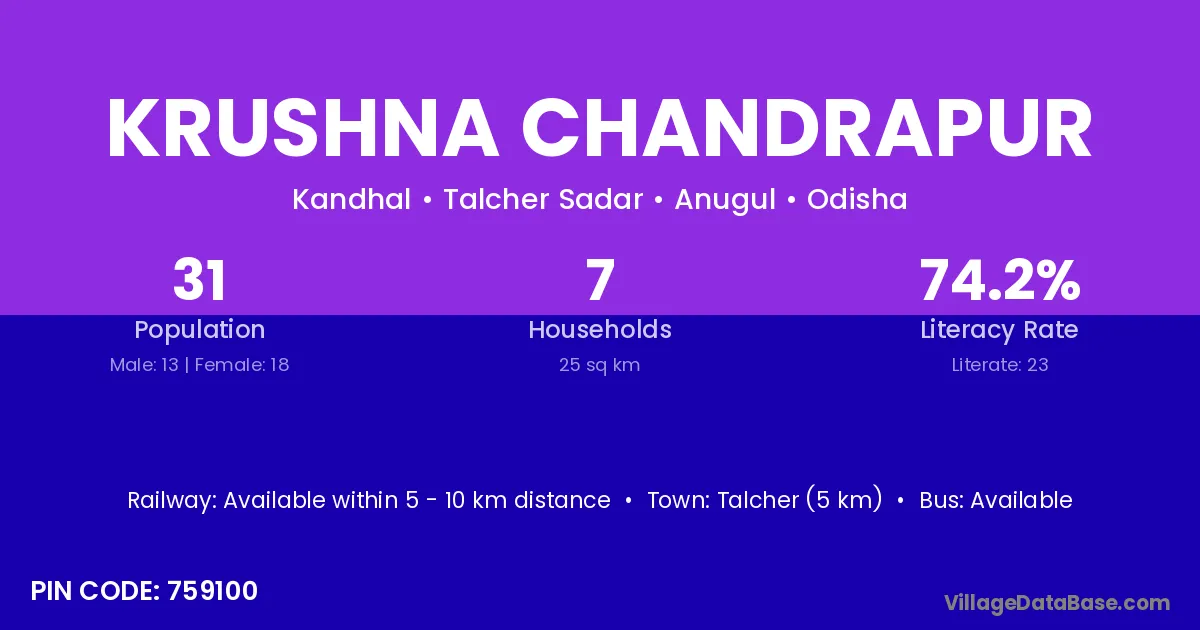 Talcher (5 km) is the nearest town to Krushna Chandrapur village for major economic activities and is located approximately 5 km away.