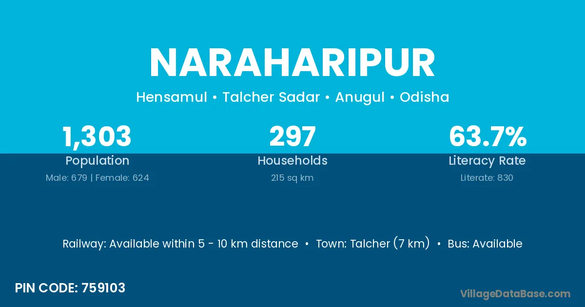 Naraharipur village has a total population of 1,303 people, of which 679 are males and 624 are females.