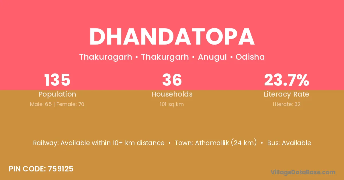 Athamallik (24 km) is the nearest town to Dhandatopa village for major economic activities and is located approximately 24 km away.