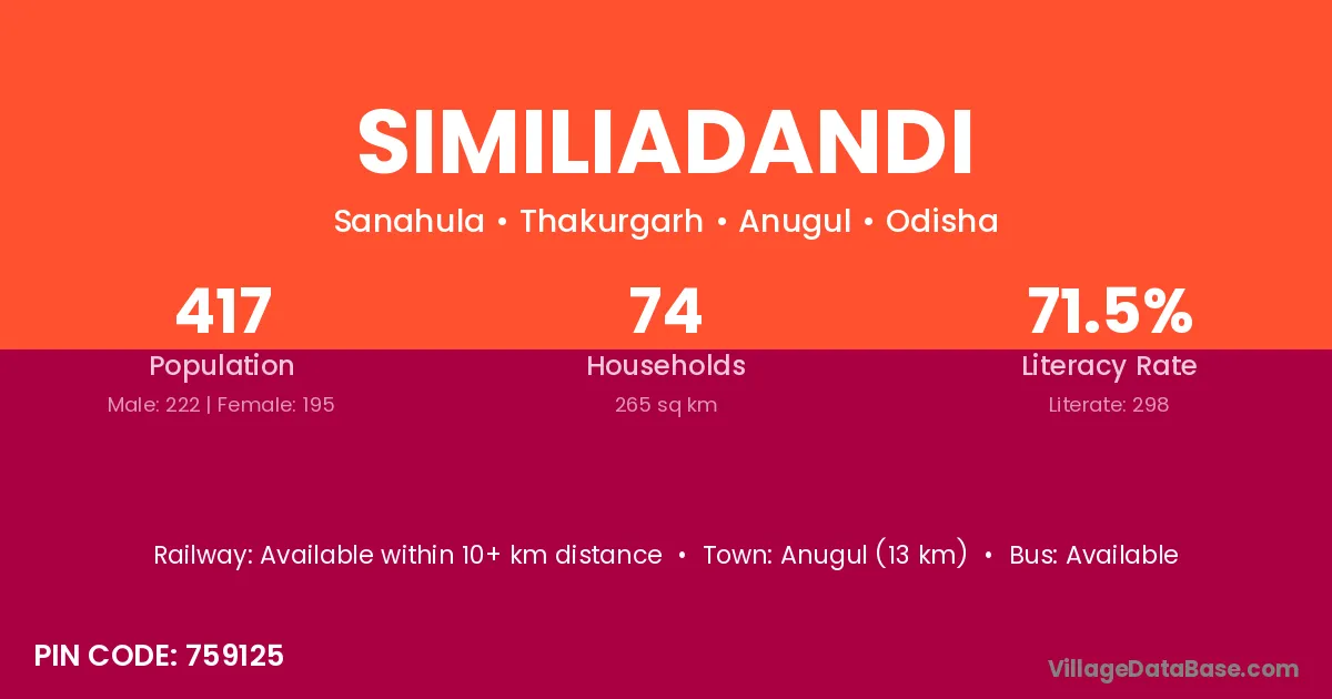 Anugul (13 km) is the nearest town to Similiadandi village for major economic activities and is located approximately 13 km away.