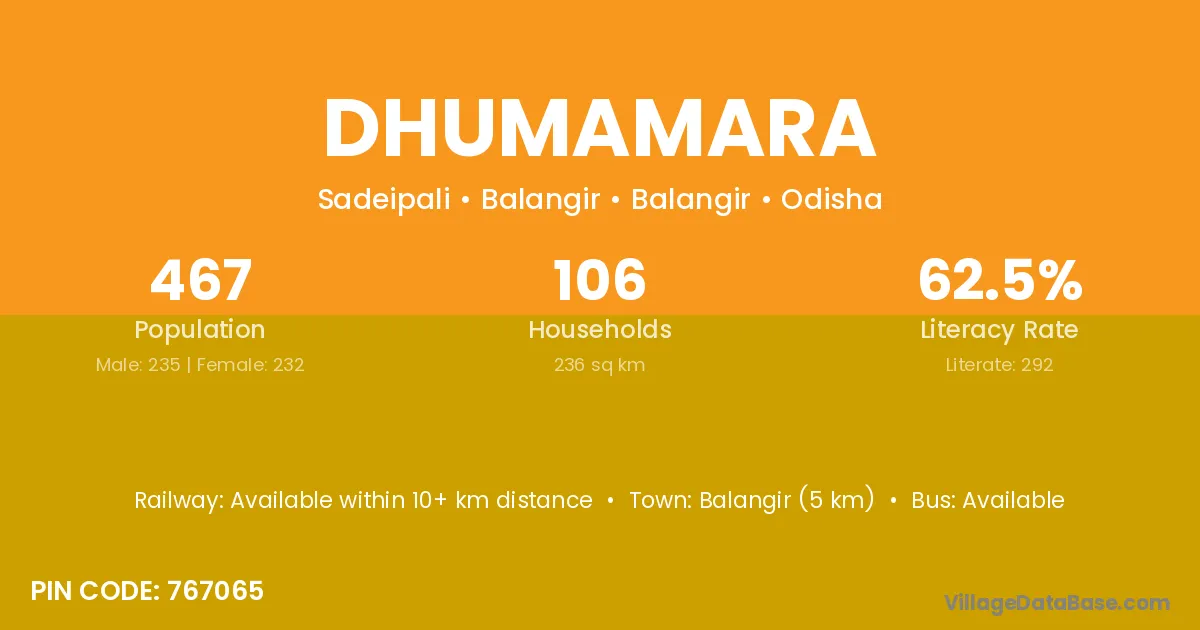 Balangir (5 km) is the nearest town to Dhumamara village for major economic activities and is located approximately 5 km away.
