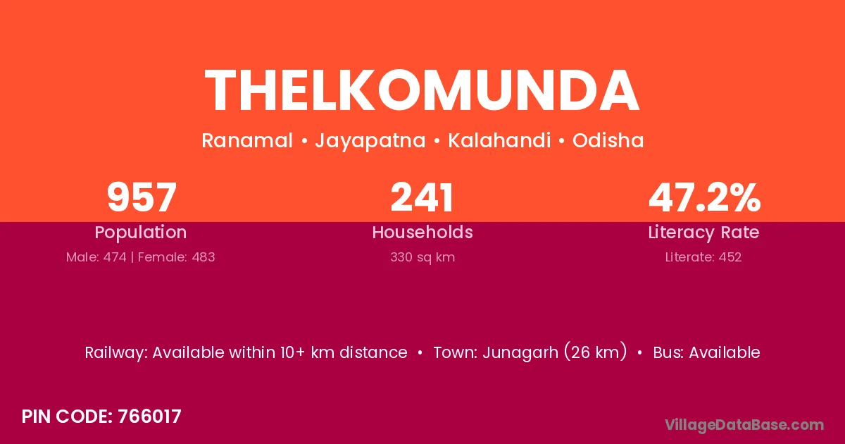 Thelkomunda village has a total population of 967 people, of which 474 are males and 493 are females.
