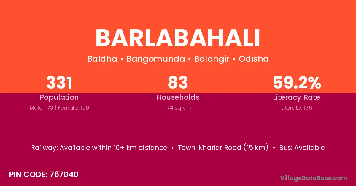 Khariar Road (15 km) is the nearest town to Barlabahali village for major economic activities and is located approximately 15 km away.