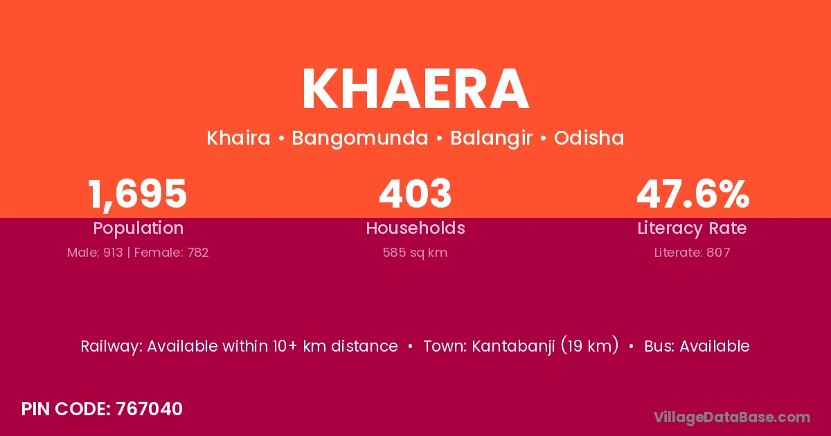 Kantabanji (19 km) is the nearest town to Khaera village for major economic activities and is located approximately 19 km away.