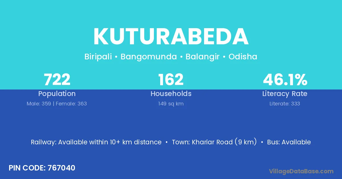 Khariar Road (9 km) is the nearest town to Kuturabeda village for major economic activities and is located approximately 9 km away.