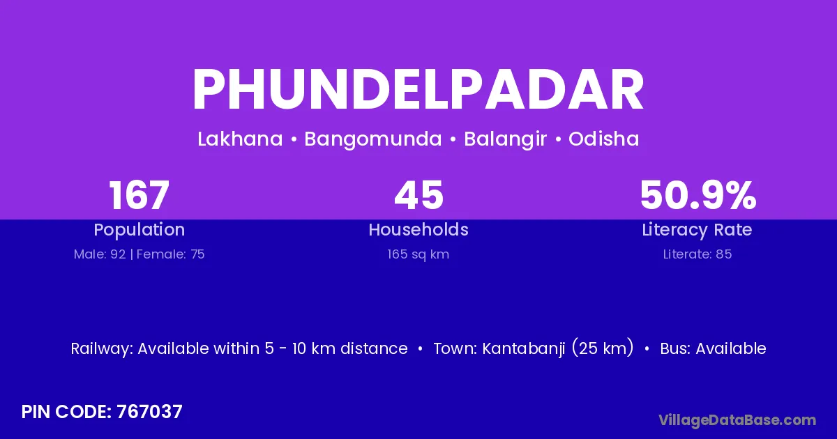 Kantabanji (25 km) is the nearest town to Phundelpadar village for major economic activities and is located approximately 25 km away.