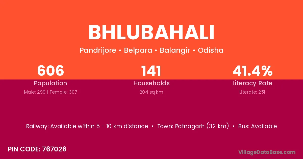 Patnagarh (32 km) is the nearest town to Bhlubahali village for major economic activities and is located approximately 32 km away.