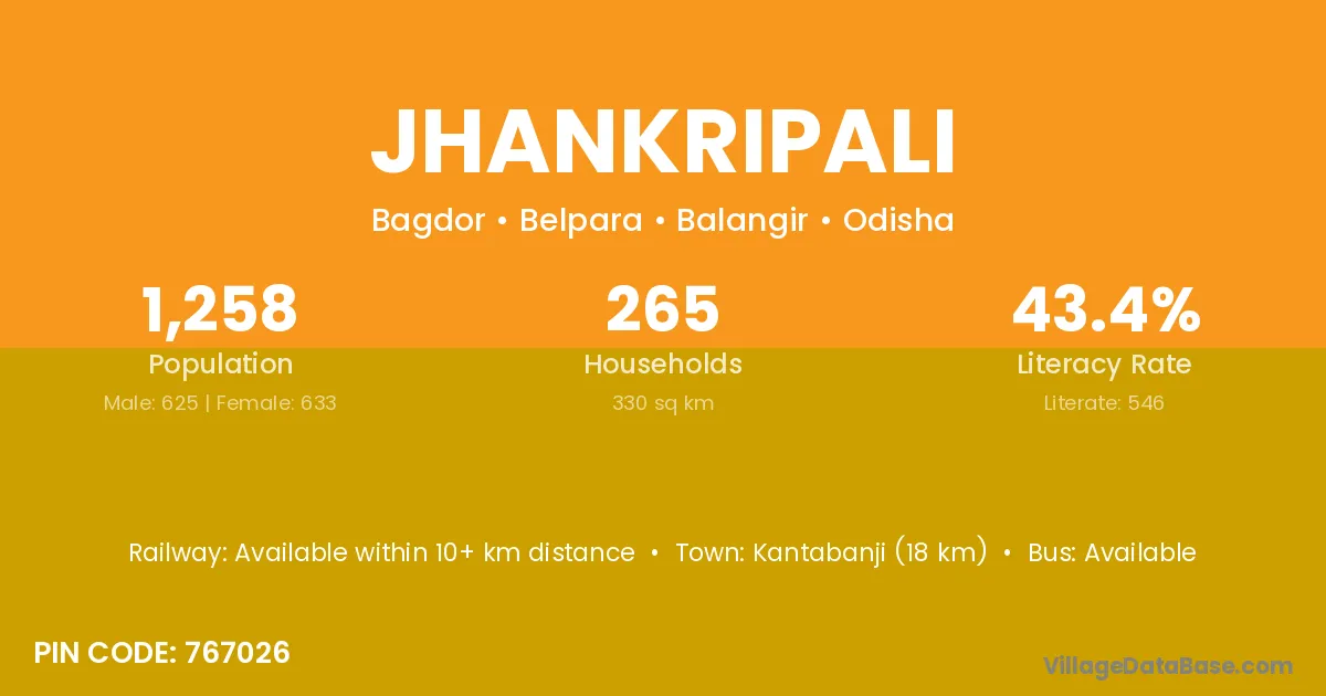Kantabanji (18 km) is the nearest town to Jhankripali village for major economic activities and is located approximately 18 km away.