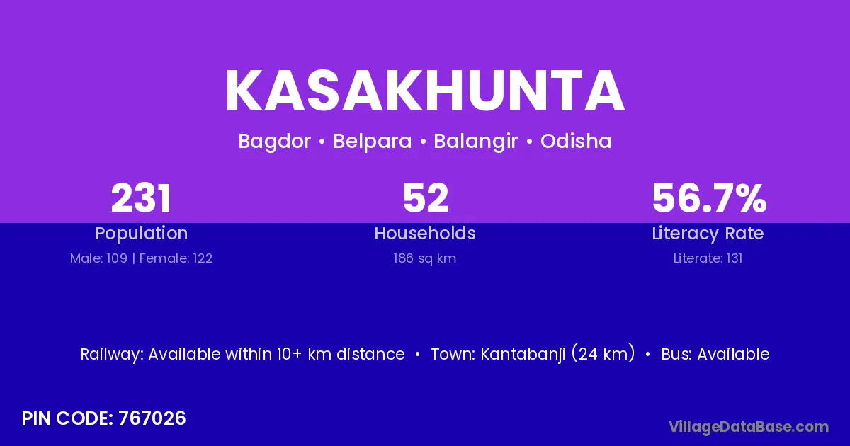 Kasakhunta village has a total population of 231 people, of which 109 are males and 122 are females.