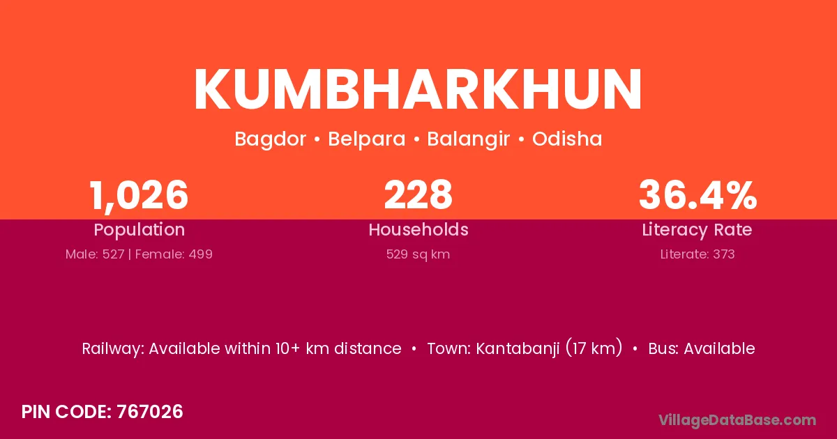 Kantabanji (17 km) is the nearest town to Kumbharkhun village for major economic activities and is located approximately 17 km away.