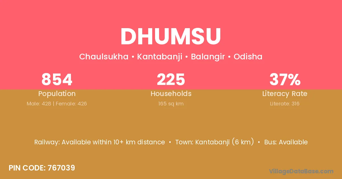 Kantabanji (6 km) is the nearest town to Dhumsu village for major economic activities and is located approximately 6 km away.