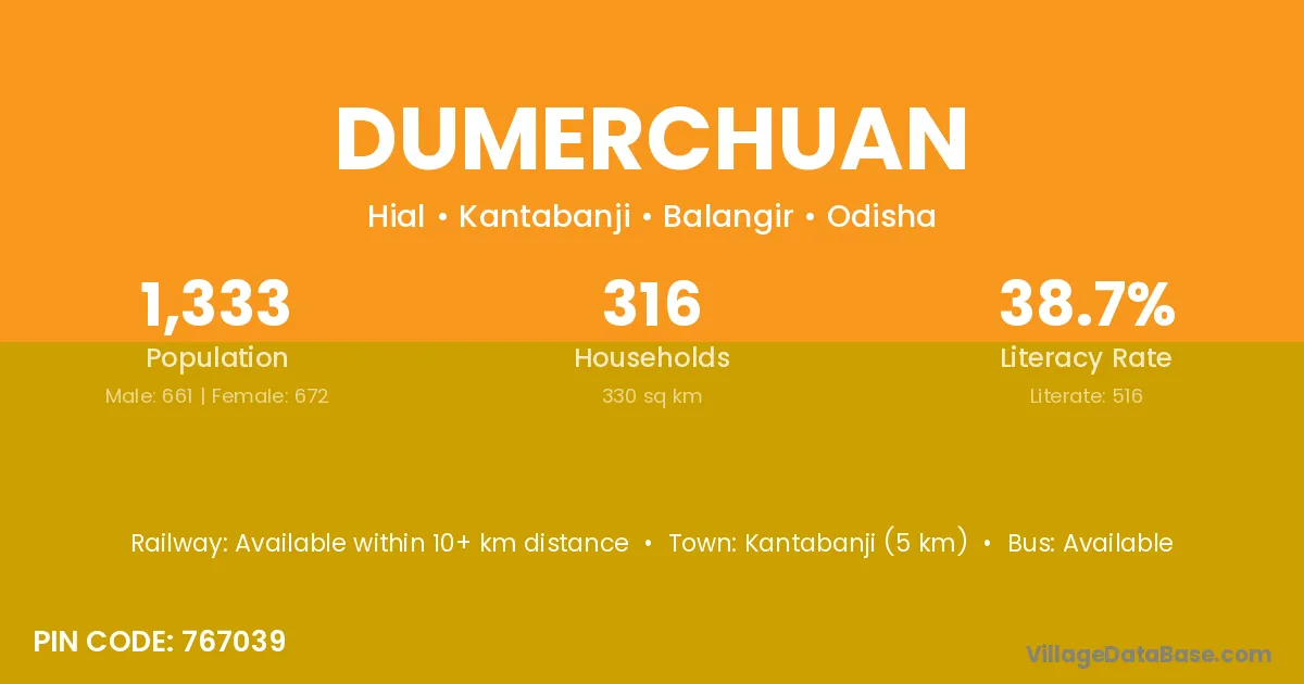 Kantabanji (5 km) is the nearest town to Dumerchuan village for major economic activities and is located approximately 5 km away.