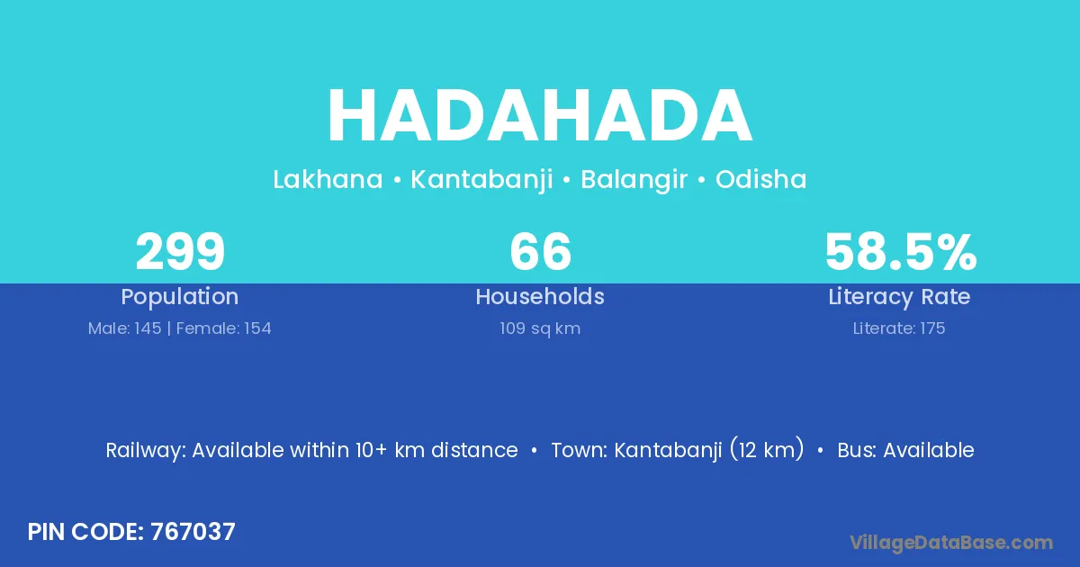 Kantabanji (12 km) is the nearest town to Hadahada village for major economic activities and is located approximately 12 km away.