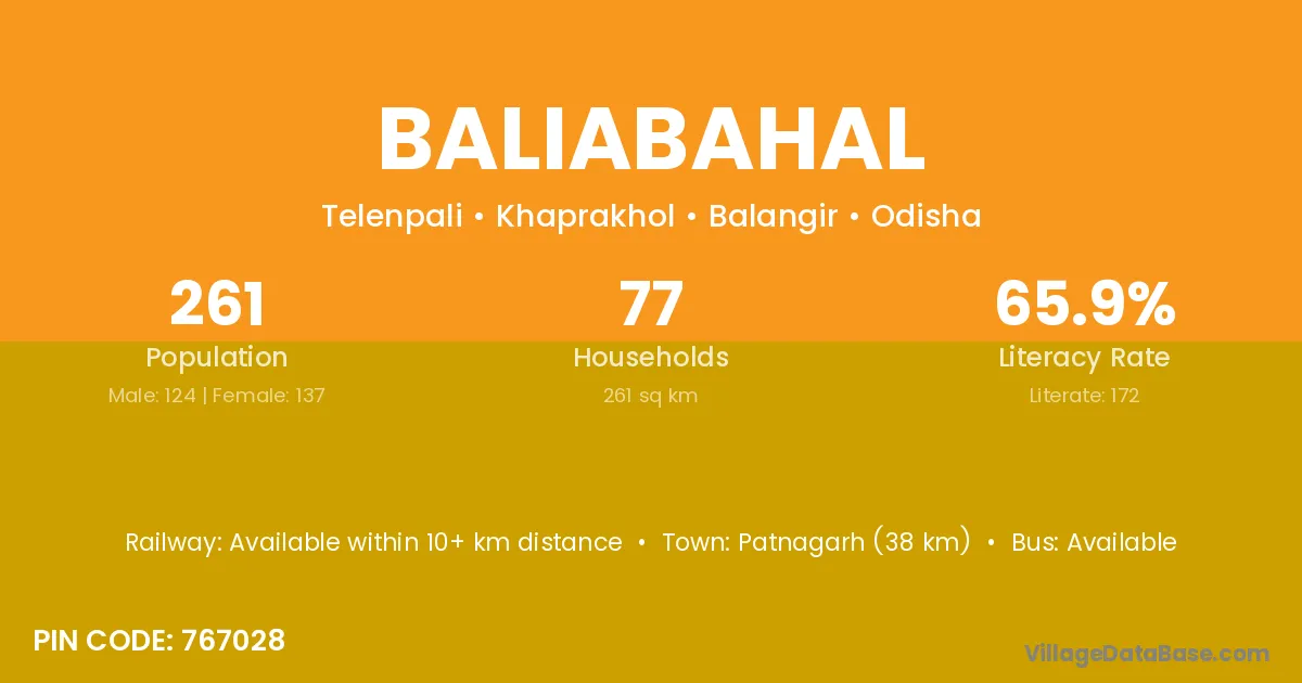 Patnagarh (38 km) is the nearest town to Baliabahal village for major economic activities and is located approximately 38 km away.