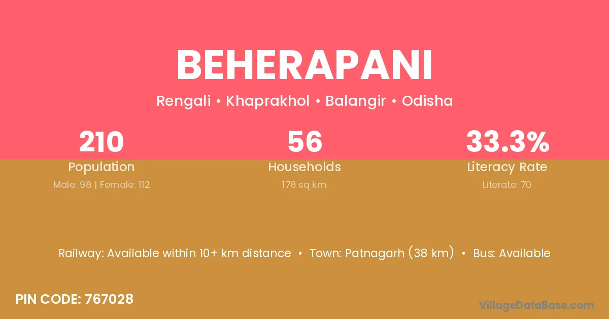 Patnagarh (38 km) is the nearest town to Beherapani village for major economic activities and is located approximately 38 km away.