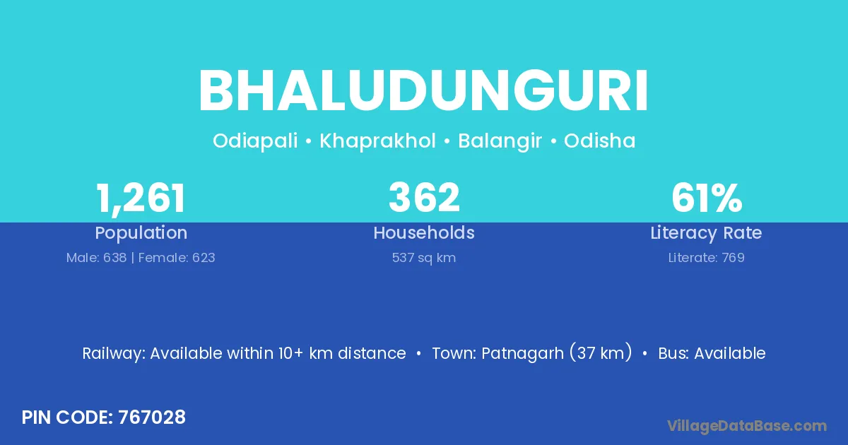 Patnagarh (37 km) is the nearest town to Bhaludunguri village for major economic activities and is located approximately 37 km away.