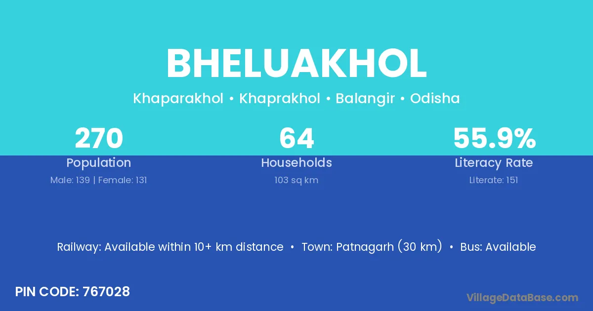 Patnagarh (30 km) is the nearest town to Bheluakhol village for major economic activities and is located approximately 30 km away.