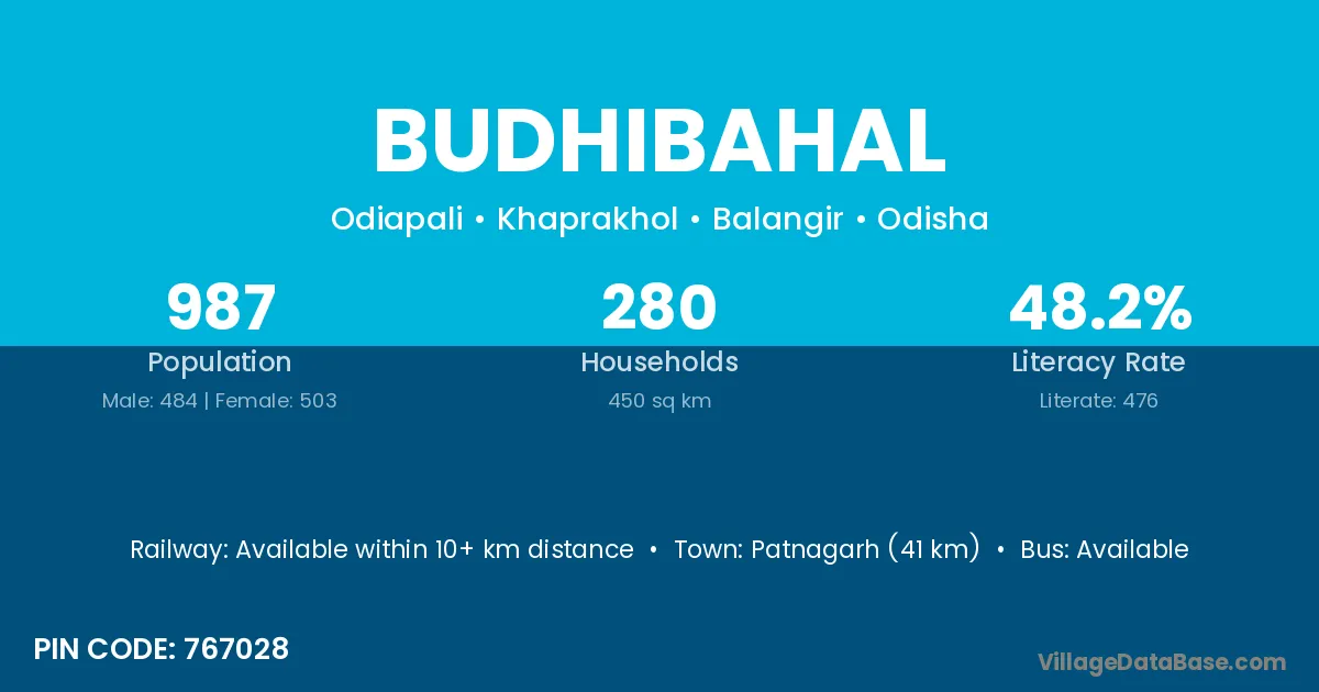 Patnagarh (41 km) is the nearest town to Budhibahal village for major economic activities and is located approximately 41 km away.