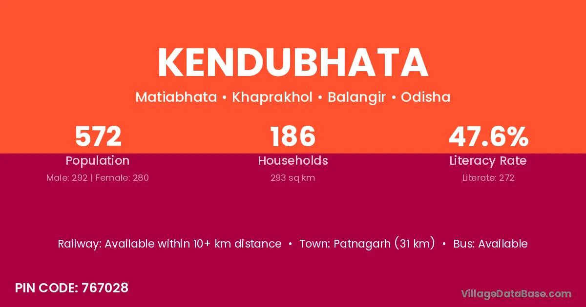 Patnagarh (31 km) is the nearest town to Kendubhata village for major economic activities and is located approximately 31 km away.