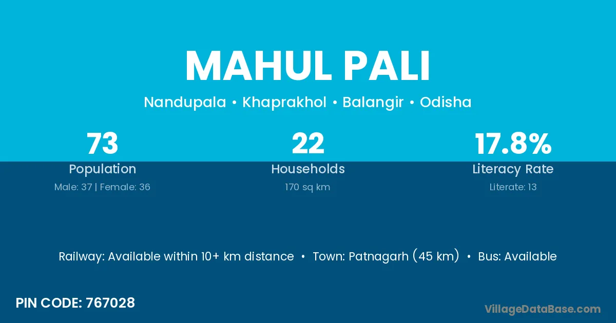 Patnagarh (45 km) is the nearest town to Mahul Pali village for major economic activities and is located approximately 45 km away.