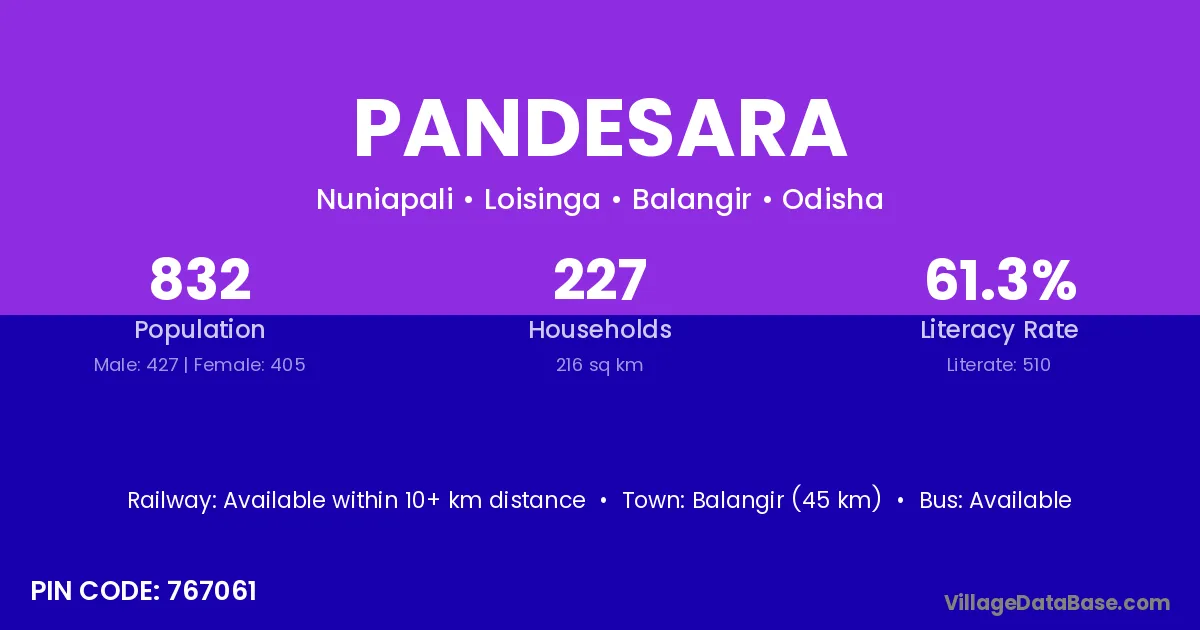 Balangir (45 km) is the nearest town to Pandesara village for major economic activities and is located approximately 45 km away.