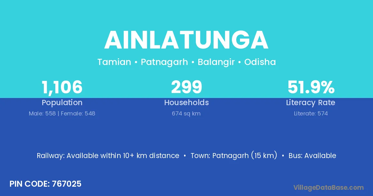 Patnagarh (15 km) is the nearest town to Ainlatunga village for major economic activities and is located approximately 15 km away.
