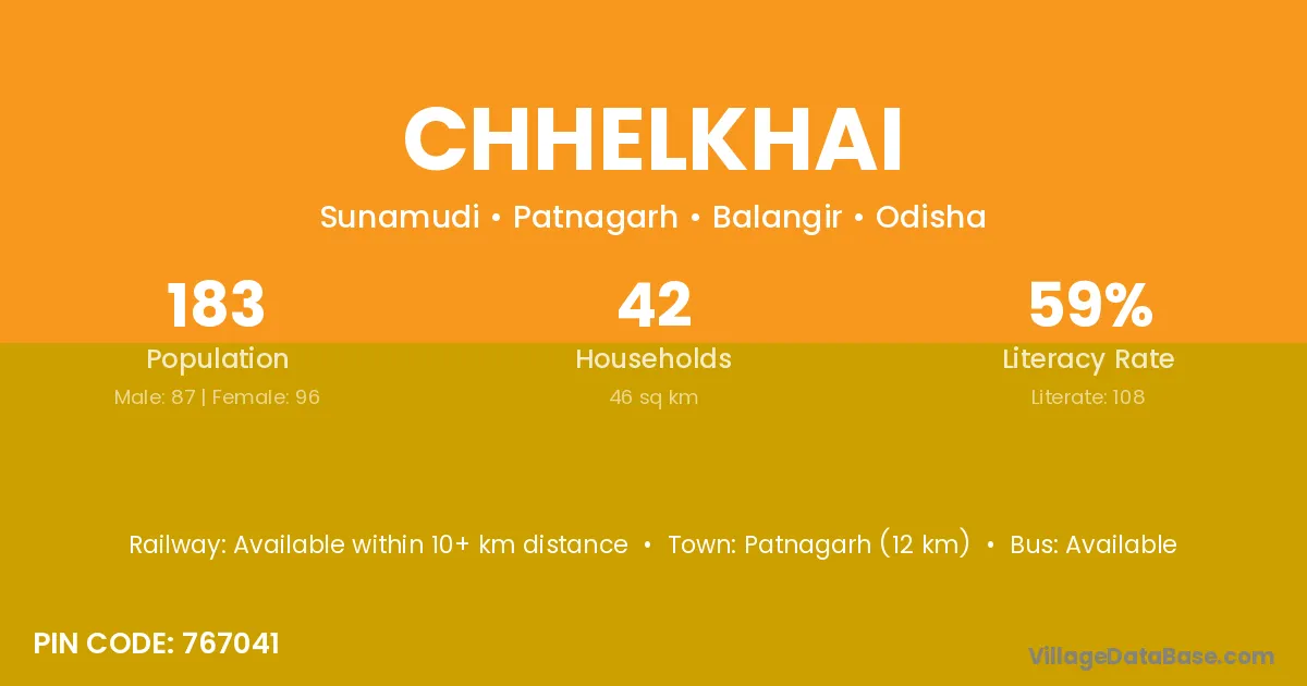 Patnagarh (12 km) is the nearest town to Chhelkhai village for major economic activities and is located approximately 12 km away.