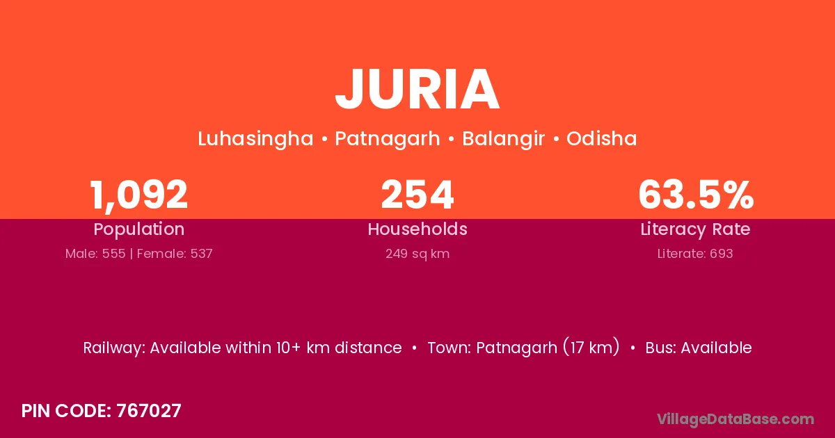Patnagarh (17 km) is the nearest town to Juria village for major economic activities and is located approximately 17 km away.