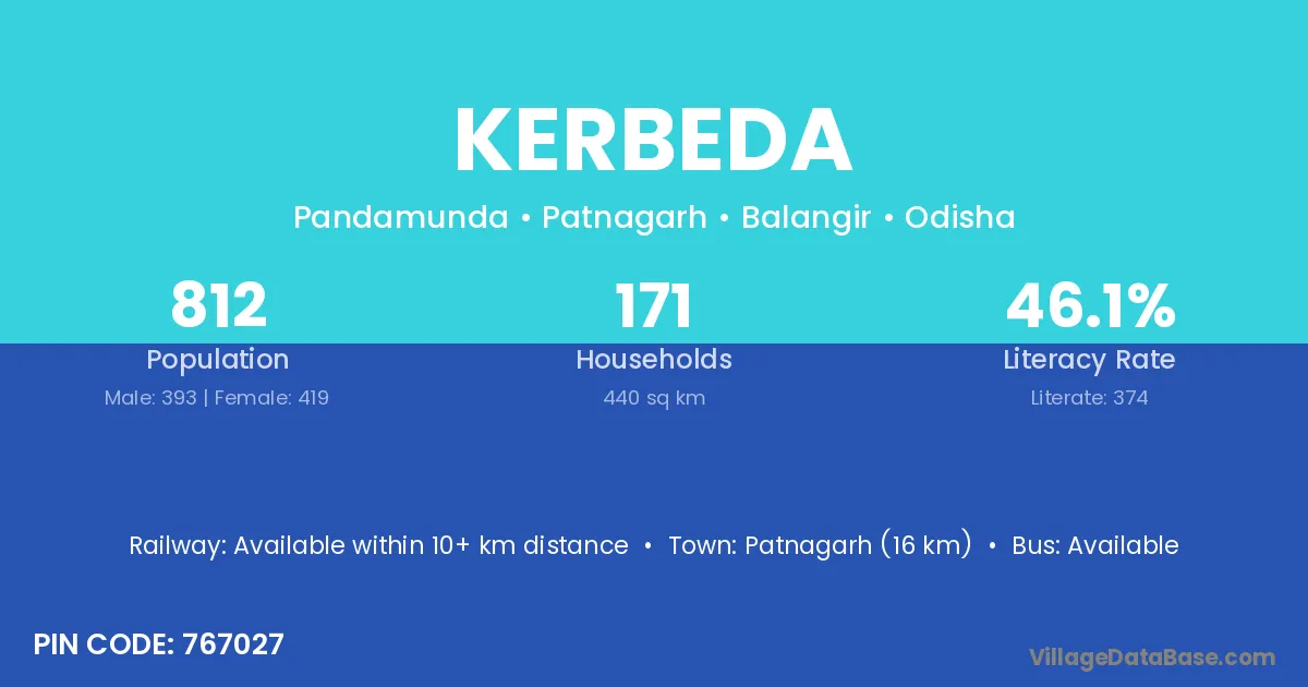 Patnagarh (16 km) is the nearest town to Kerbeda village for major economic activities and is located approximately 16 km away.