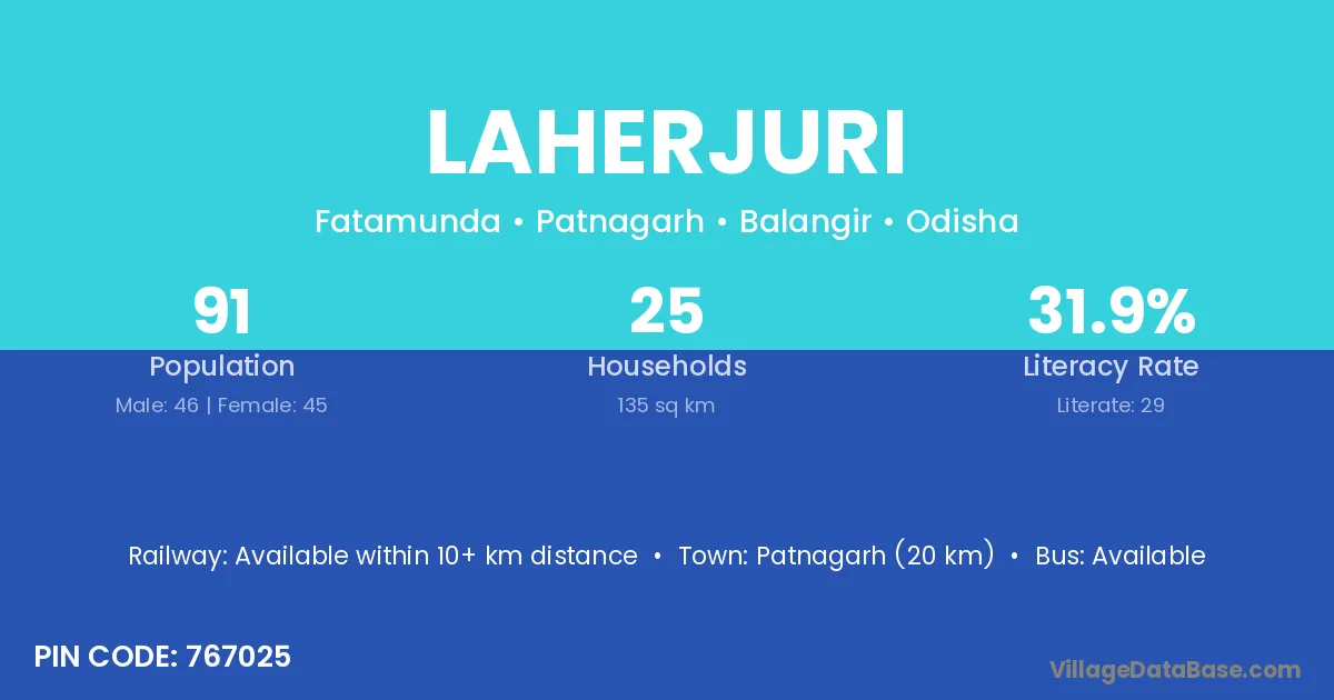 Patnagarh (20 km) is the nearest town to Laherjuri village for major economic activities and is located approximately 20 km away.