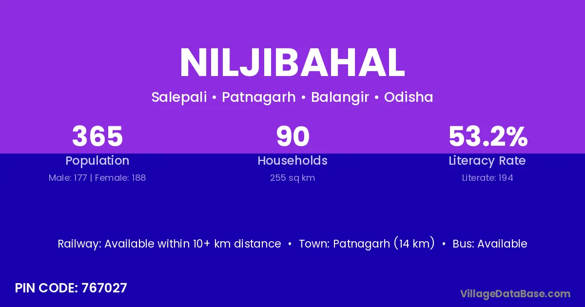 Patnagarh (14 km) is the nearest town to Niljibahal village for major economic activities and is located approximately 14 km away.