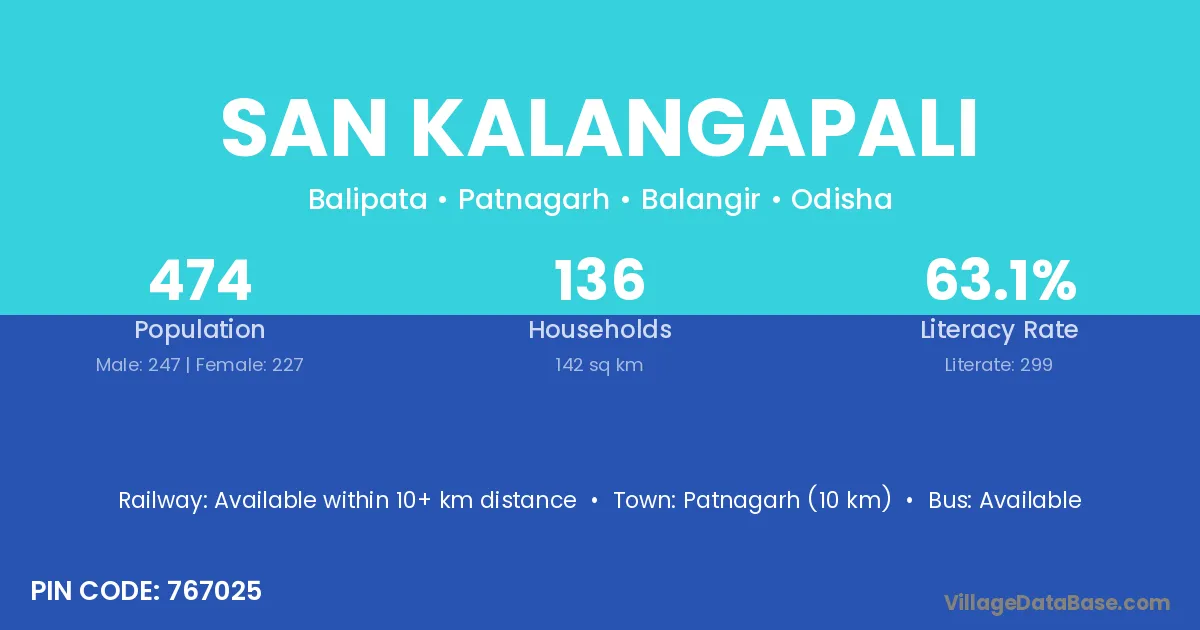 Patnagarh (10 km) is the nearest town to San Kalangapali village for major economic activities and is located approximately 10 km away.