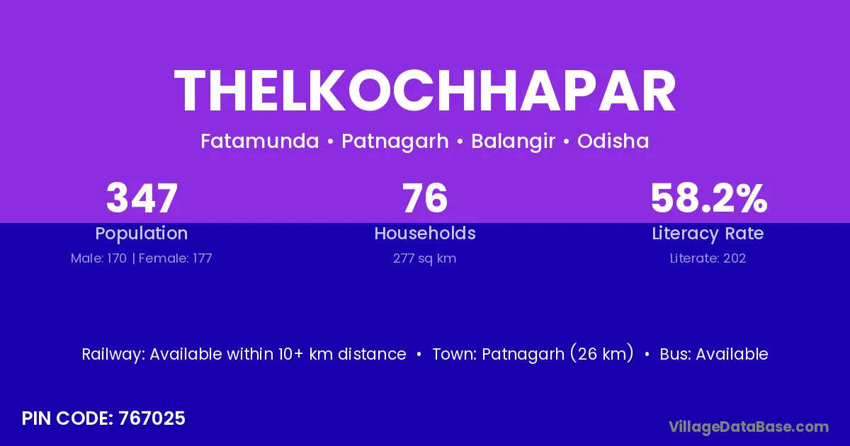Patnagarh (26 km) is the nearest town to Thelkochhapar village for major economic activities and is located approximately 26 km away.