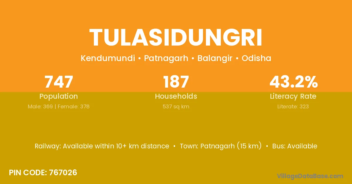 Patnagarh (15 km) is the nearest town to Tulasidungri village for major economic activities and is located approximately 15 km away.