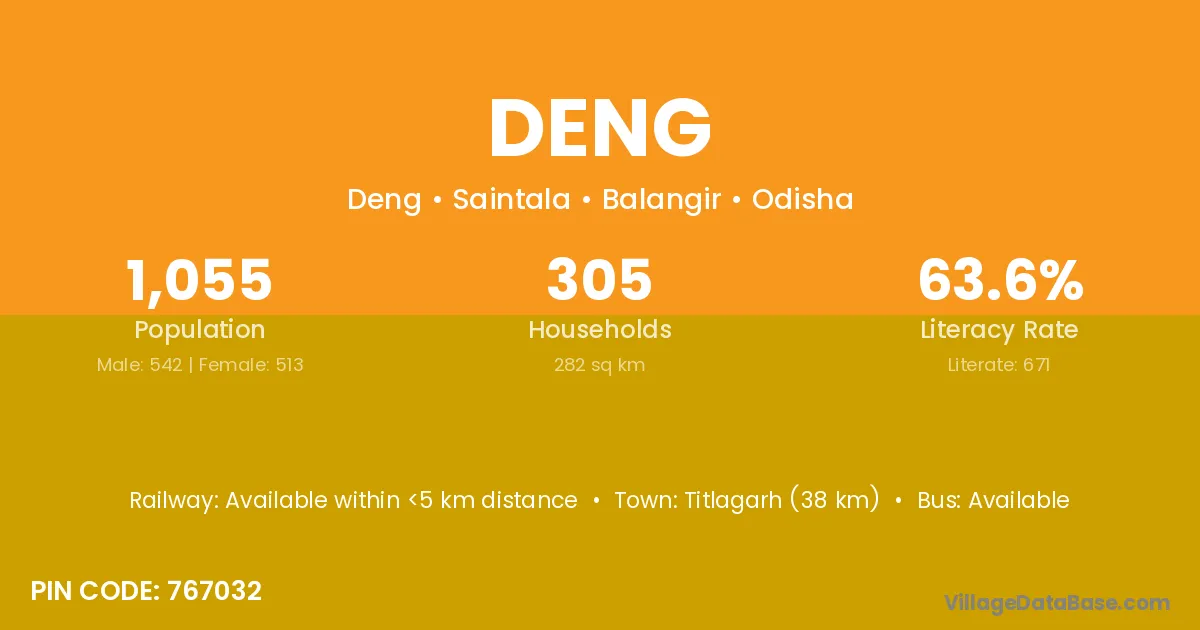 Titlagarh (38 km) is the nearest town to Deng village for major economic activities and is located approximately 38 km away.