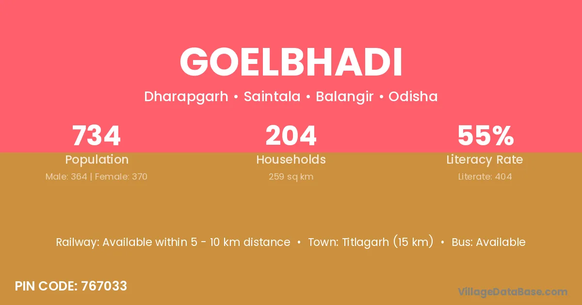 Titlagarh (15 km) is the nearest town to Goelbhadi village for major economic activities and is located approximately 15 km away.