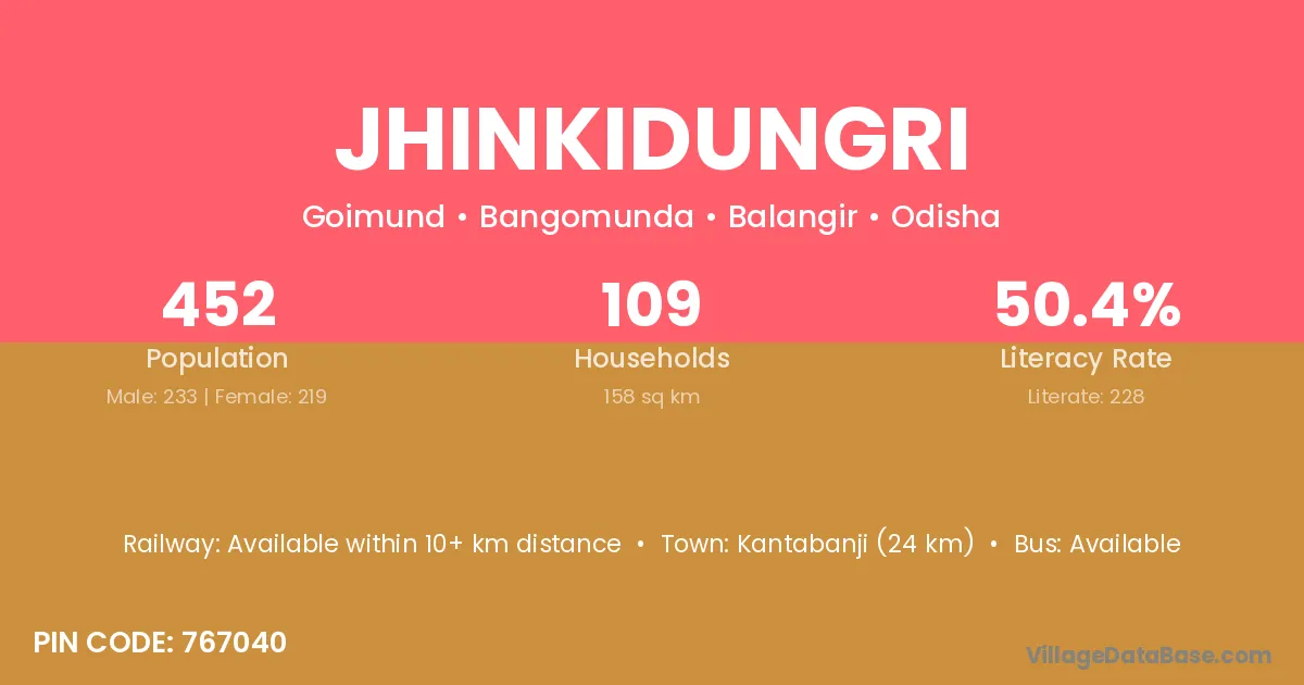 Kantabanji (28 km) is the nearest town to Jhinkidungri village for major economic activities and is located approximately 28 km away.