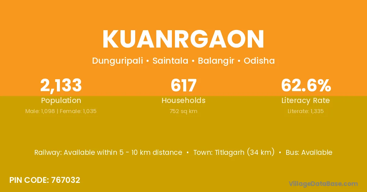 Titlagarh (34 km) is the nearest town to Kuanrgaon village for major economic activities and is located approximately 34 km away.