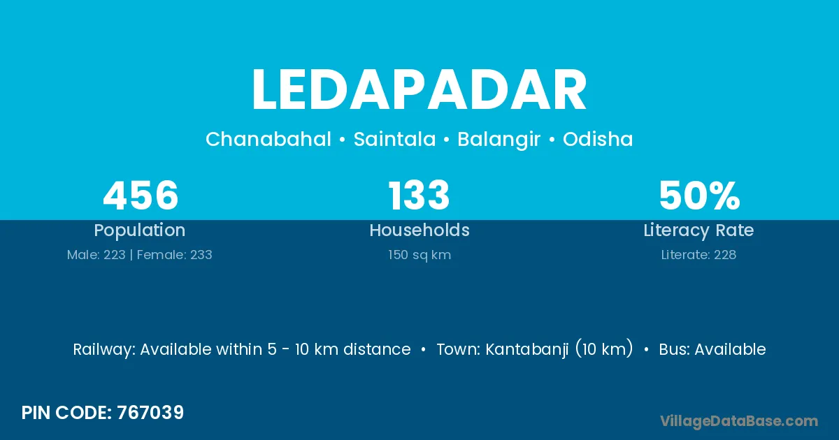 Kantabanji (10 km) is the nearest town to Ledapadar village for major economic activities and is located approximately 10 km away.