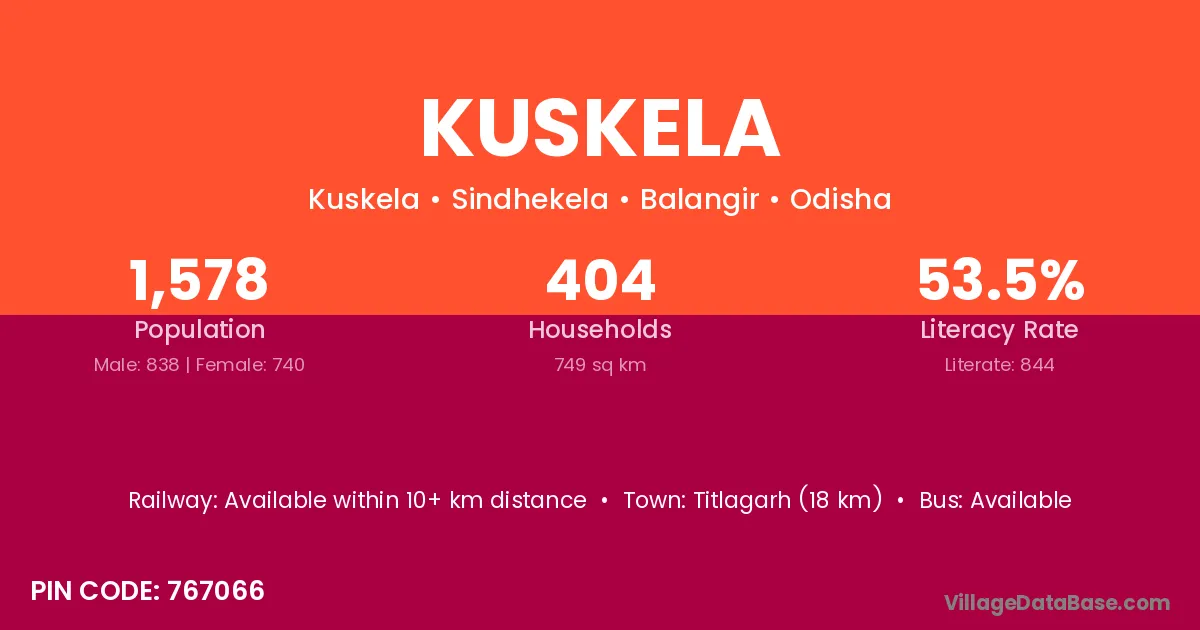 Titlagarh (18 km) is the nearest town to Kuskela village for major economic activities and is located approximately 18 km away.
