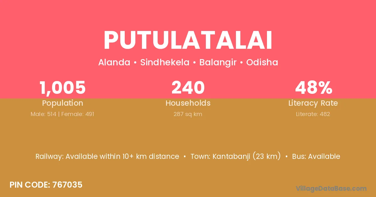 Kantabanji (23 km) is the nearest town to Putulatalai village for major economic activities and is located approximately 23 km away.